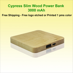 Cypress Bamboo Wood Slim Power Bank, 3000 mAh. Price includes FREE 1 PMS color logo print or logo etched 1 location. UL Certified Grade A Battery with 12 month warranty. WITH TARRIFS IN EFFECT PLEASE CALL TO CONFIRM PRICING JUST IN CASE THEY HAVE CHANGED. WITH TARRIFS IN EFFECT PLEASE CALL TO CONFIRM PRICING JUST IN CASE THEY HAVE CHANGED WITH TARRIFS IN EFFECT PLEASE CALL TO CONFIRM PRICING JUST IN CASE THEY HAVE CHANGED